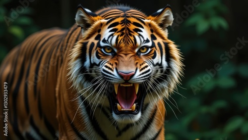 © benjamas, Fototapeta premium Ferocious Tiger Roaring with Bared Teeth in Dense Forest Habitat During Daylight