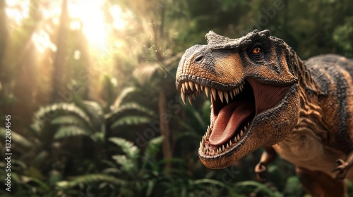 © Newleks, Obraz premium Ferocious tyrannosaurus rex roaring, revealing razor sharp teeth and tongue, standing amid dense prehistoric jungle bathed in golden sunlight