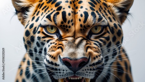 © CreativeBro, Obraz premium ferocious visage of a hand-painted leopard on a white canvas tattoo