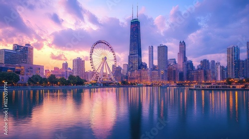 Fototapeta premium Ferris wheel towering over a scenic city skyline at twilight, framed by a...