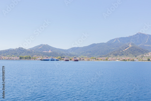 Fototapeta premium Ferry port at Thasos Island, Greece, with ferries docked and scenic mountain...