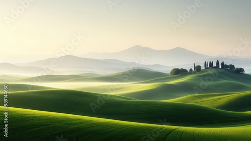 © Creator88, Fototapeta premium Fertile green hills at sunrise, morning mist hanging low, golden light on the horizon, high-definition, soft focus, tranquil atmosphere