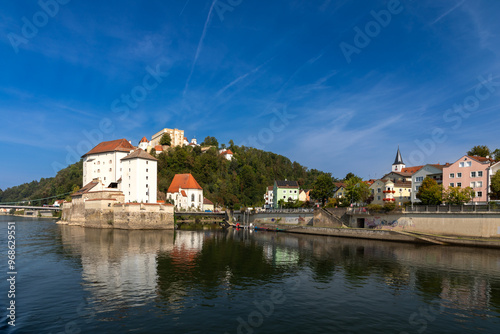 Fototapeta premium Feste Niederhaus am Zusammenfluss von Donau und Ilz in Passau, Bayern