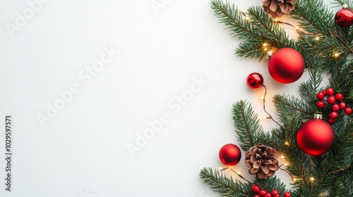 © Achira22, Fototapeta premium Festive arrangement of red Christmas ornaments and evergreen branches with soft glowing lights, creating a cheerful holiday atmosphere. copy space