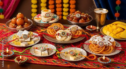 © Taha, Naklejka premium Festive arrangement of sweets and rakhi bracelets on a decorated table for celebration ai generated
