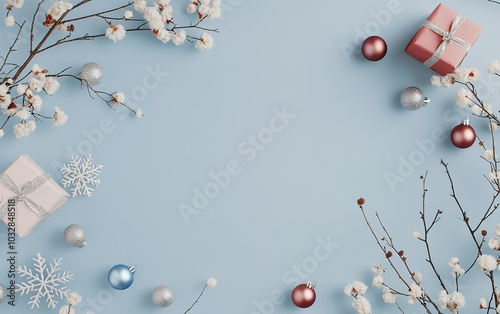 © BYAI, Fototapeta premium Festive arrangement with Christmas gifts, ornaments, and decorative branches on a light blue background during the holiday season