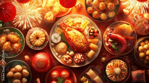 © Atmospheric stock, Fototapeta premium Festive asian new year feast with fireworks display