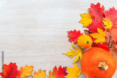 Obraz premium Festive autumn decor from pumpkins and leaves on a wooden background.
