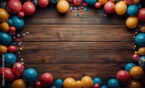 Obraz premium Festive Background with Colorful Balloons and Wooden Surface