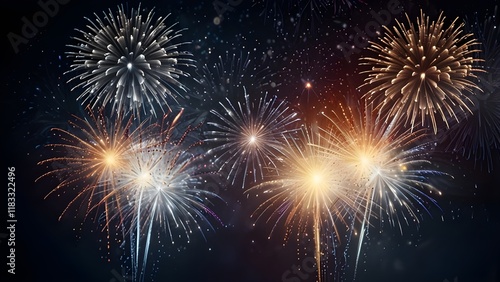 © Nadir, Naklejka premium Festive background with fireworks and lights in silver colors. Generative AI