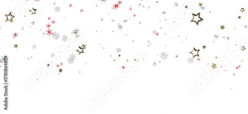 Obraz premium Festive background with gold stars, red and white snowflakes on a white backdrop, perfect for Christmas, winter and holiday themed designs.