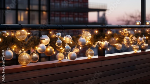 © Matty, Naklejka premium Festive balcony decoration for Christmas and New Year. Close up of Christmas decoration balls and garland of lights wrapped around balcony railing in modern residential apartment building