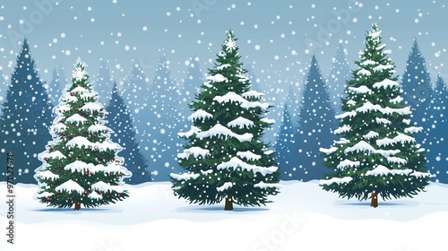 © Zeenat, Fototapeta premium Festive banner with Christmas tree forest and snowy elements.