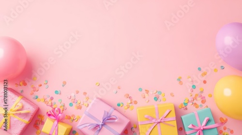 Fototapeta premium Festive birthday celebration with colorful gift boxes balloons and confetti on a soft pink background