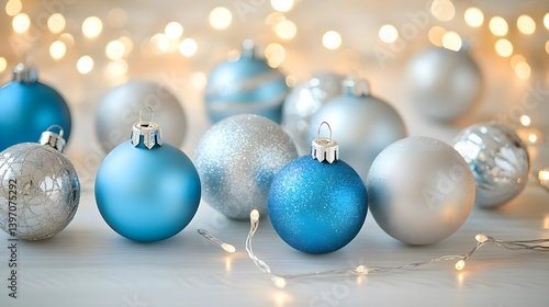 Fototapeta premium Festive Blue and Silver Christmas Ornaments with Soft Background