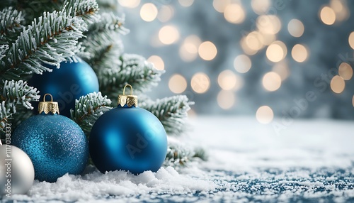 Fototapeta premium Festive Blue Christmas Ornaments Snow Winter Background