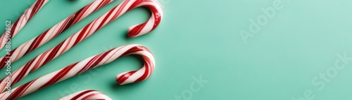 Fototapeta premium Festive candy canes with red and white stripes on a turquoise background. Perfect for Christmas and holiday-themed projects and designs.
