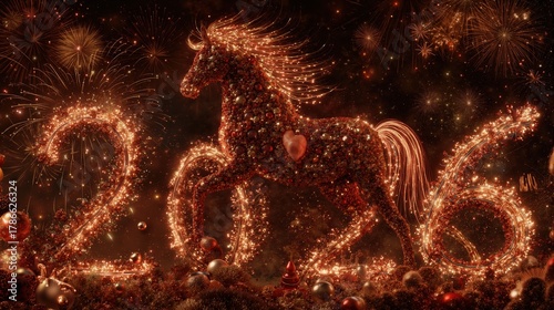 Naklejka premium Festive celebration with fiery horse and fireworks illuminating 2026 new year...