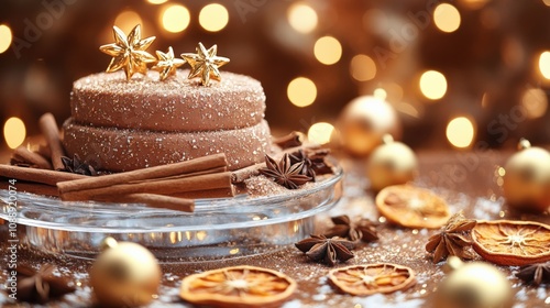 © GOOD BRAND, Fototapeta premium Festive Chocolate Cake Decorated with Stars and Oranges for a Celebration