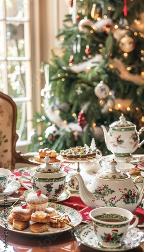 Naklejka premium Festive Christmas Afternoon Tea Setup with Fine China, Holiday Pastries, and Decorated Tree
