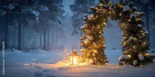 Naklejka premium Festive Christmas arch made of fir branches with string lights, and a lantern with a candle in a snowy night forest.