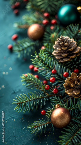 Fototapeta premium Festive Christmas Background with Pine Cones, Ornaments, and Sprigs of Evergreen for Seasonal Designs