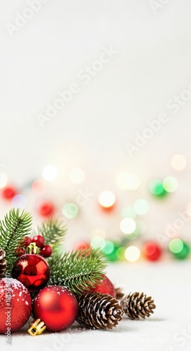 © Nina, Fototapeta premium Festive Christmas background with traditional red ornaments, natural pine cones, green fir branches, and sparkling bokeh lights on a snowy surface, perfect for holiday greetings.
