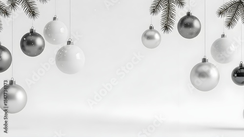 Obraz premium Festive Christmas baubles and pine branches suspended in a minimalist white...