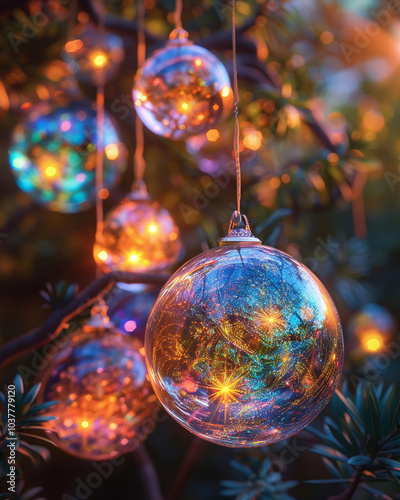 Naklejka premium Festive Christmas Baubles with Bokeh Lights and Green Foliage