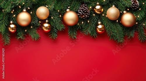 Fototapeta premium Festive Christmas Border with Gold Ornaments and Pine Branches on Red Background