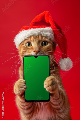© pijav4uk, Naklejka premium Festive christmas cat in santa hat holding smartphone with chroma key screen