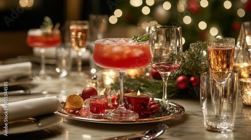 Naklejka premium Festive Christmas cocktails on a decorated dinner table.