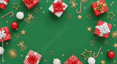 Obraz premium Festive christmas decorations on green background with gift boxes and ornaments.