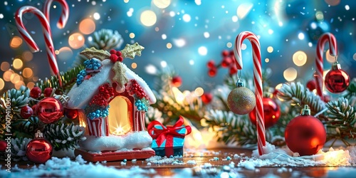 © Diffin, Naklejka premium Festive Christmas decorations with candy canes, ornaments, and a gingerbread house on a snowy background