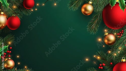 © YanabY, Naklejka premium Festive Christmas decorations with red and gold ornaments and greenery on a dark green background