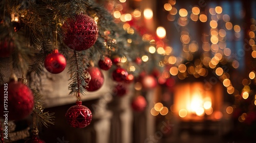 Naklejka premium Festive Christmas decorations with red ornaments and warm fire glow in a cozy atmosphere