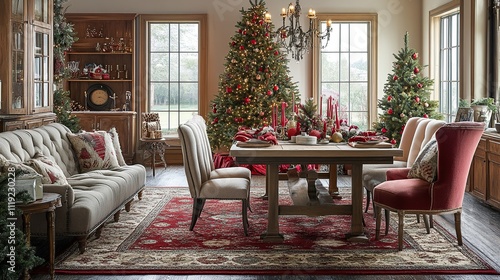 © Erik, Fototapeta premium Festive Christmas dining room with decorated tree, presents, and red accents.