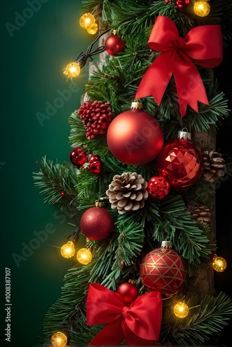 © Janis, Fototapeta premium Festive Christmas garland with red decorations against green background, holiday decor inspiration