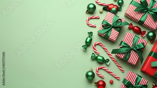 Obraz premium Festive christmas gifts and decorations on a green background