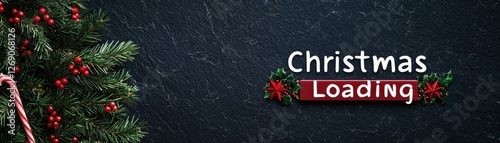 Fototapeta premium Festive Christmas Loading Graphic with Pine Leaves, Red Berries, and Decorative Candy Cane Background