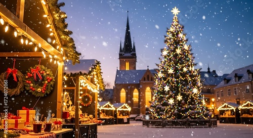 © Niril, Fototapeta premium Festive christmas market scene with a decorated tree and snow falling