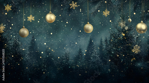 Fototapeta premium Festive Christmas night scene with a rich forest green background adorned with glittering golden ornaments and delicate snowflakes falling softly