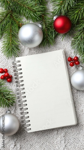 Fototapeta premium Festive christmas notebook mockup with blank page for holiday planning and design inspiration