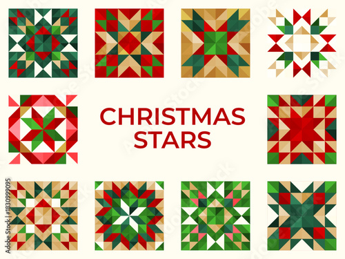 Obraz premium Festive Christmas ornaments, decoration patterns with geometric star motifs in red, green, beige, and white. Perfect for Christmas wrapping, cards, textiles, and seasonal design projects.