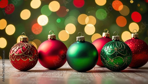 Fototapeta premium Festive Christmas ornaments in red and green with golden details on a wooden surface with bokeh lights.