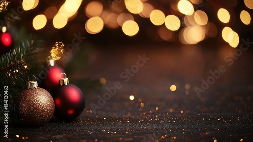 Fototapeta premium Festive Christmas Ornaments on Pine Tree with Warm Bokeh Background