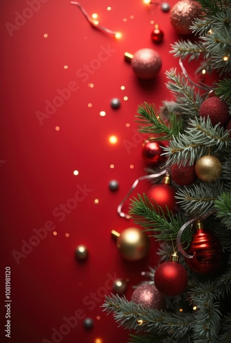 © Tetiana, Obraz premium Festive Christmas Ornaments on Red Background with Lights
