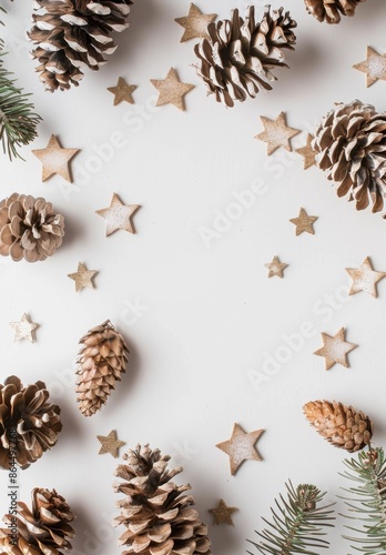 © Balaraw, Obraz premium Festive christmas pine cone and star decoration frame