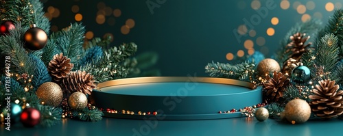 © Georgii, Naklejka premium Festive Christmas podium background with pine branches, gold ornaments, and decorative lights creating a warm holiday atmosphere