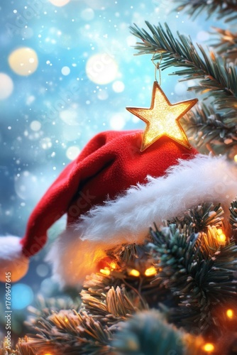 Obraz premium Festive christmas scene featuring santa hat and glowing star on evergreen...